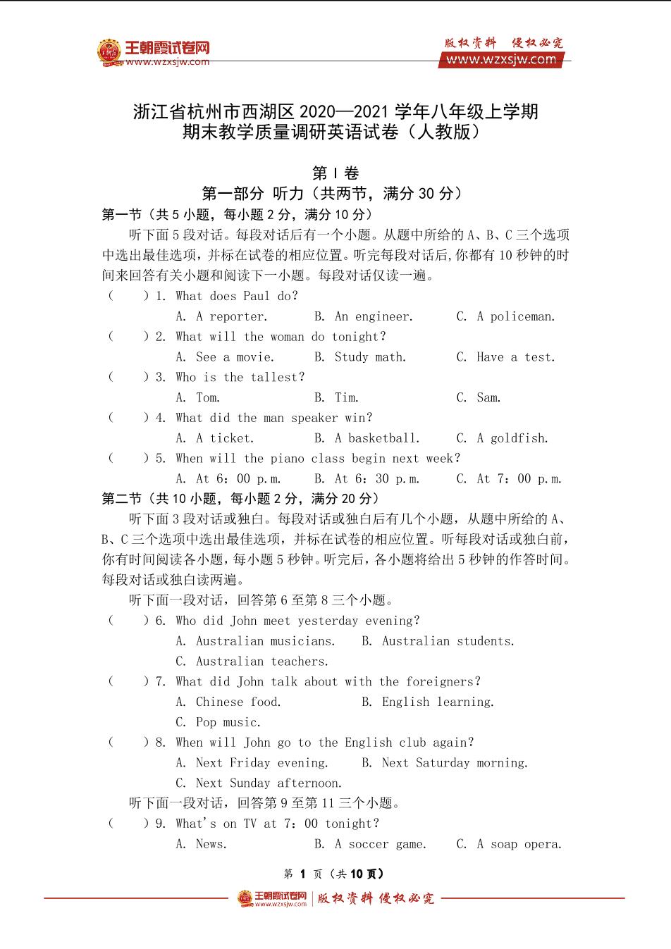 浙江省杭州市西湖区2020—2021学年八年级上学期期末教学质量调研英语试卷(人教版)