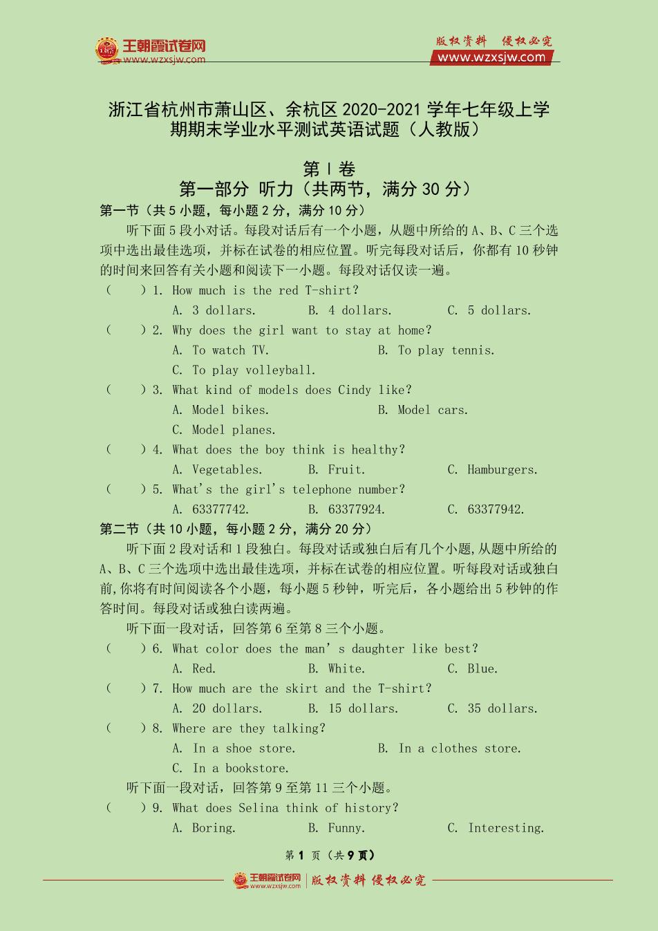 浙江省杭州市萧山区、余杭区2020-2021学年七年级上学期期末学业水平测试英语试题(人教版)