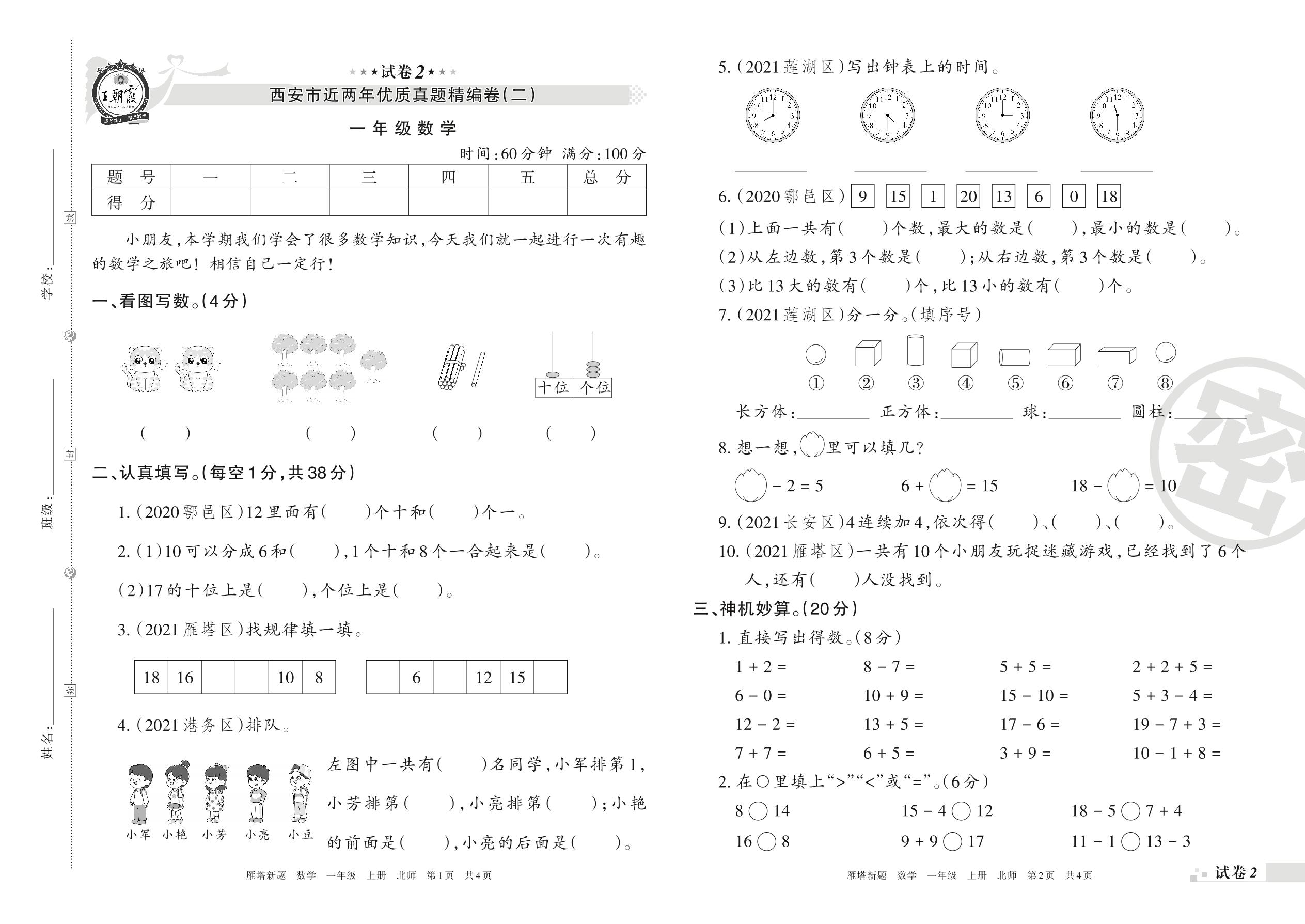 西安市近两年优质真题精编卷(二)一年级上册数学(北师版)【2】
