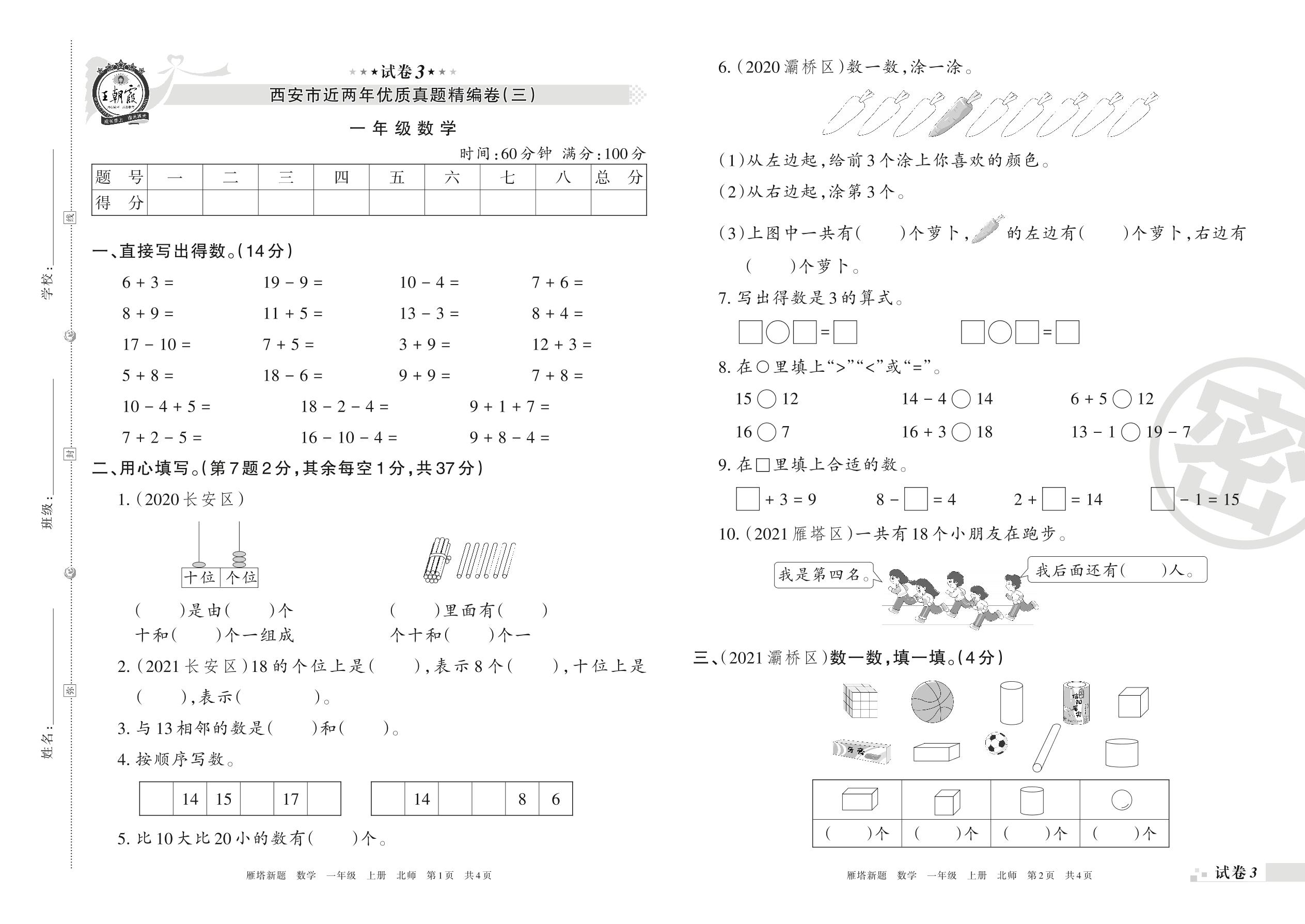 西安市近两年优质真题精编卷(三)一年级上册数学(北师版)【3】