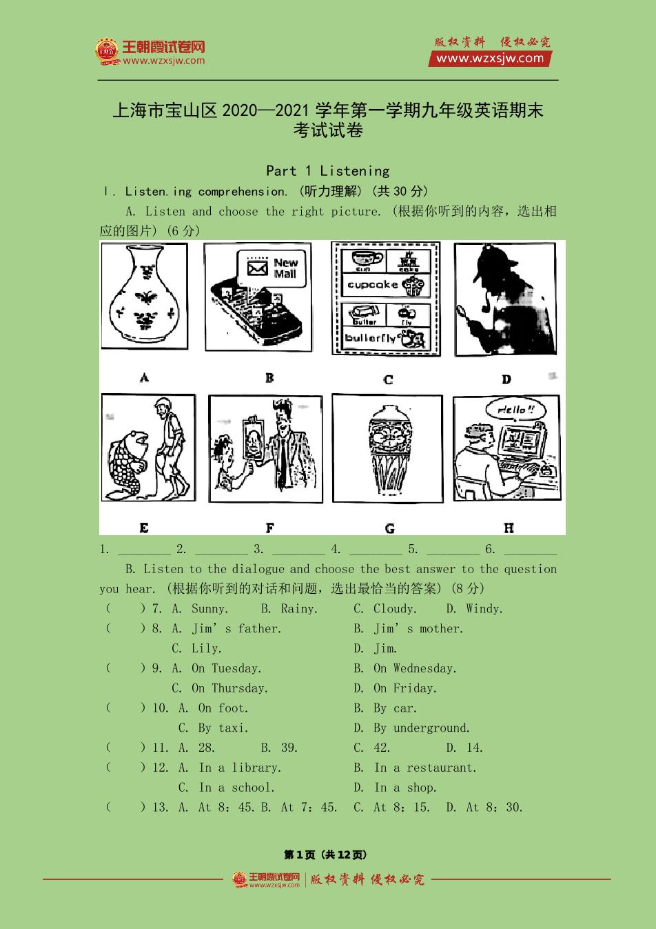 上海市宝山区2020—2021学年第一学期九年级英语期末考试试卷(沪教牛津版)