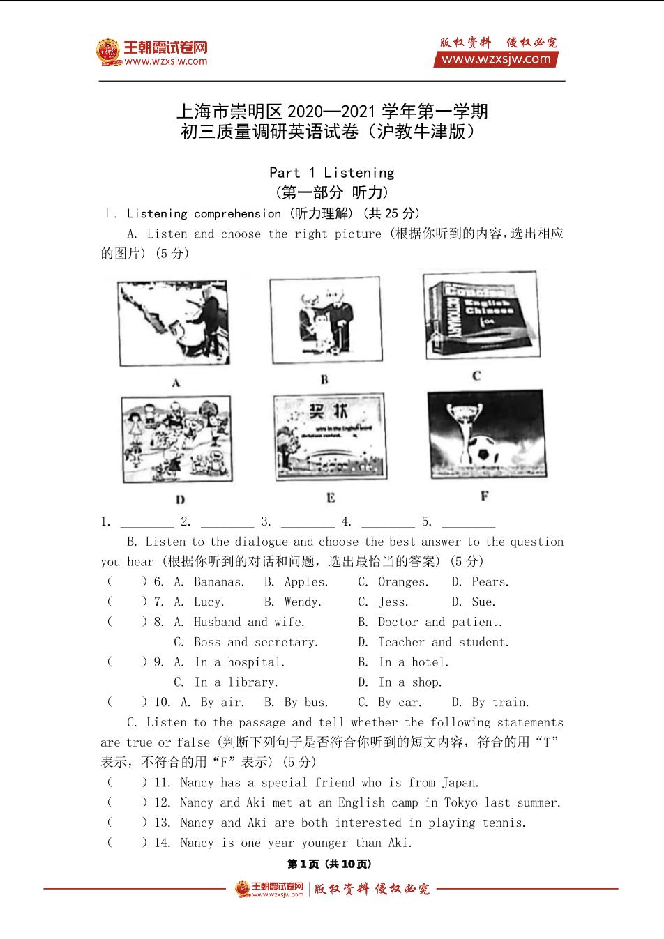 上海市崇明区2020—2021学年第一学期初三质量调研英语试卷(沪教牛津版)