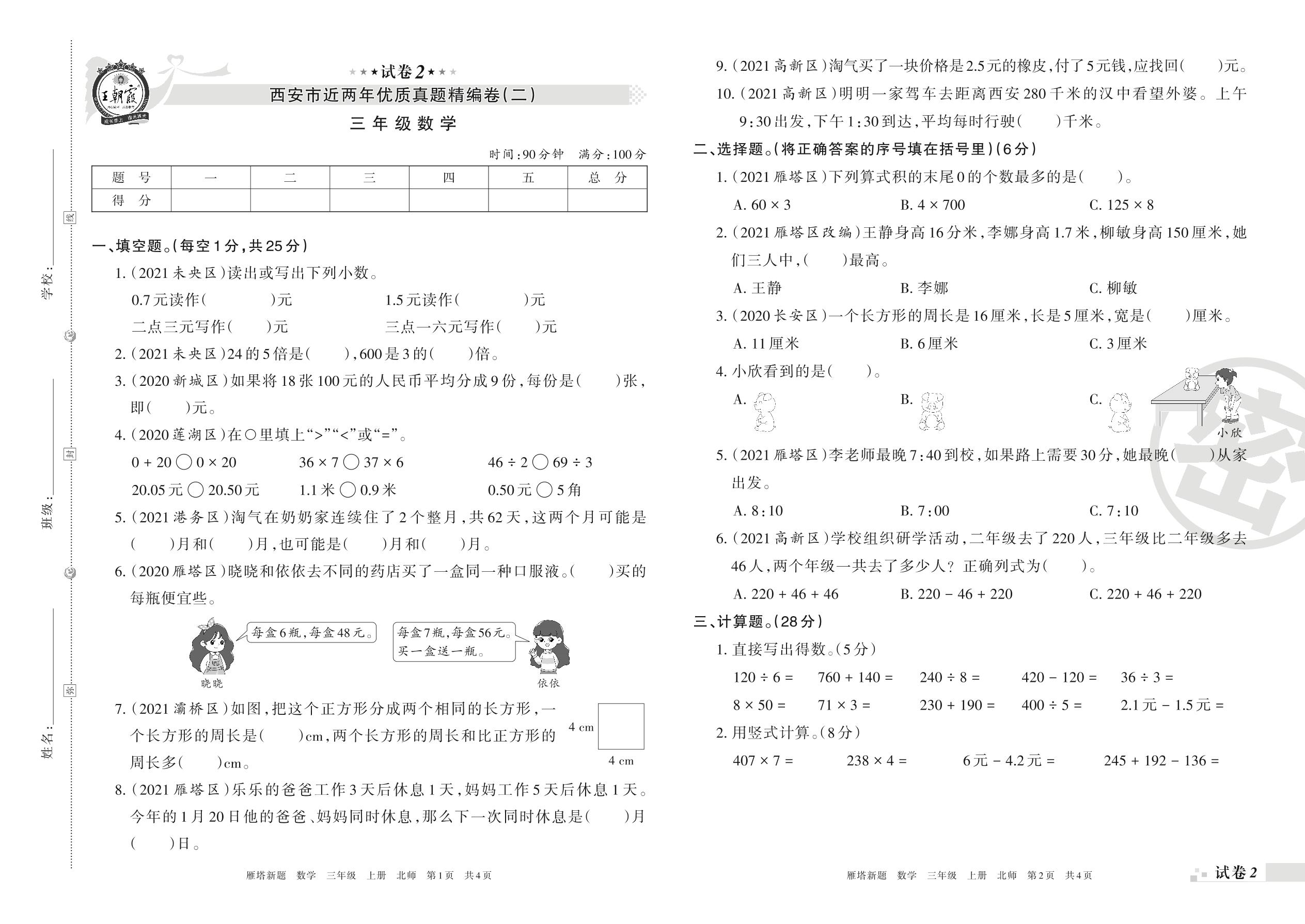 西安市近两年优质真题精编卷(二)三年级上册数学(北师版)【2】