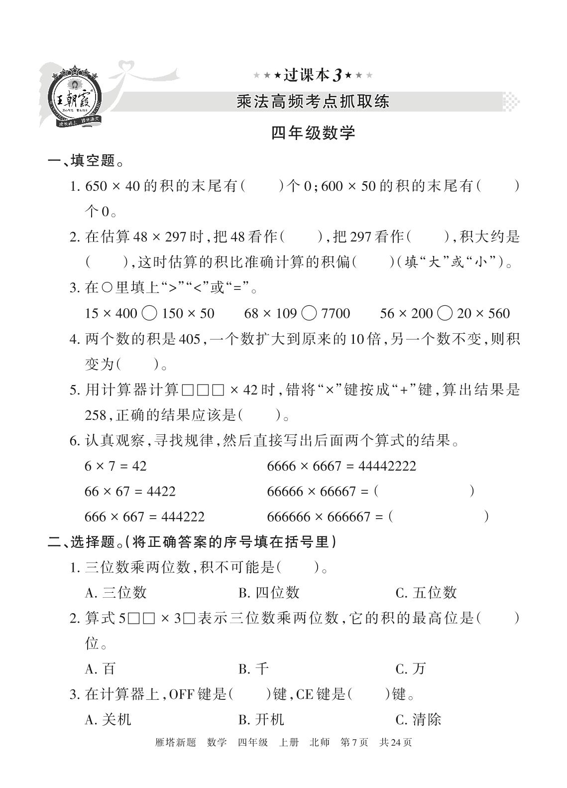 王朝霞期末过课本——乘法高频考点抓取练四年级上册数学(北师版)【3】