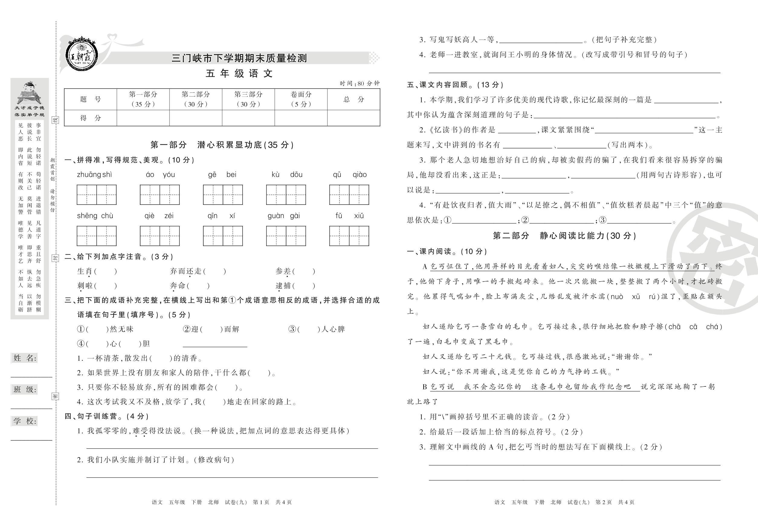 2015-2016学年第二学期三门峡市五年级语文试卷(北师版)【9】