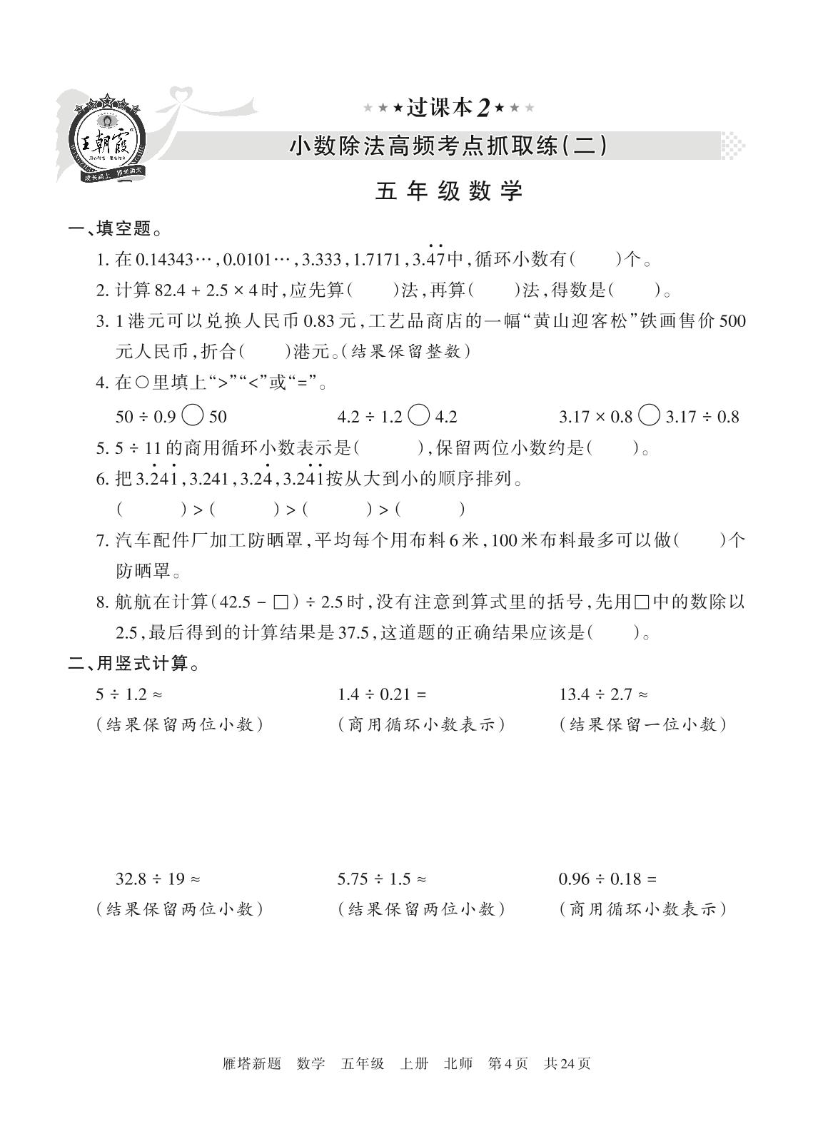 王朝霞期末过课本——小数除法高频考点抓取练(二)五年级上册数学(北师版)【2】