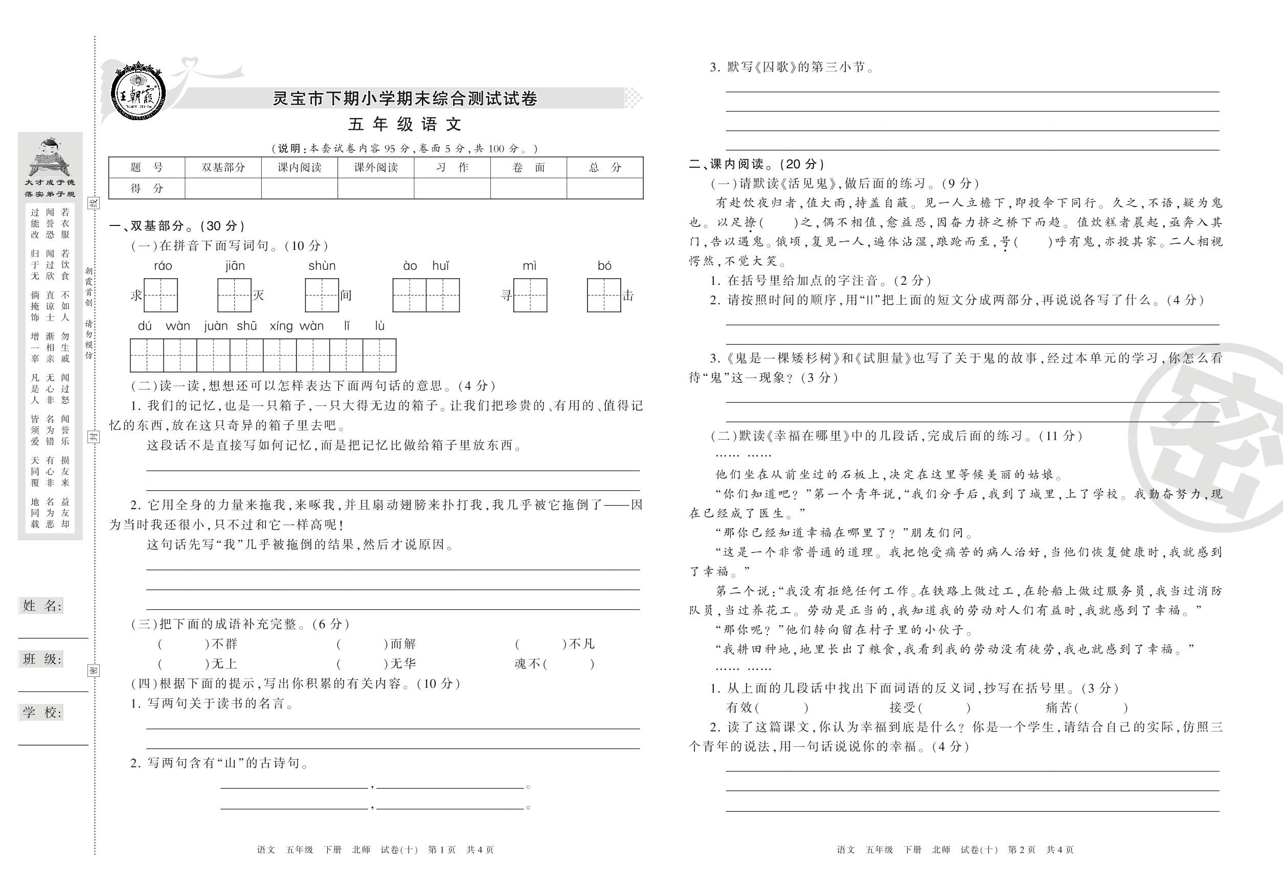 五年级语文北师版下册期末卷