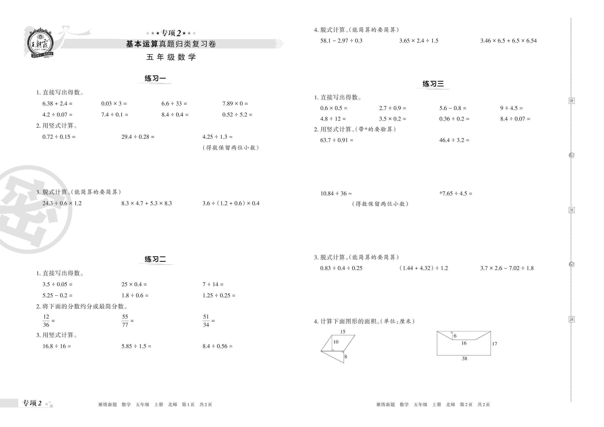 王朝霞期末专项卷——基本运算真题归类复习卷五年级上册数学(北师版)【2】