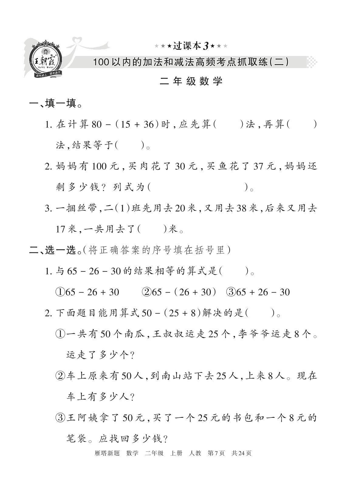 王朝霞期末过课本——100以内的加法和减法高频考点抓取练(二)二年级上册数学(人教版)_R211117172104117【3】