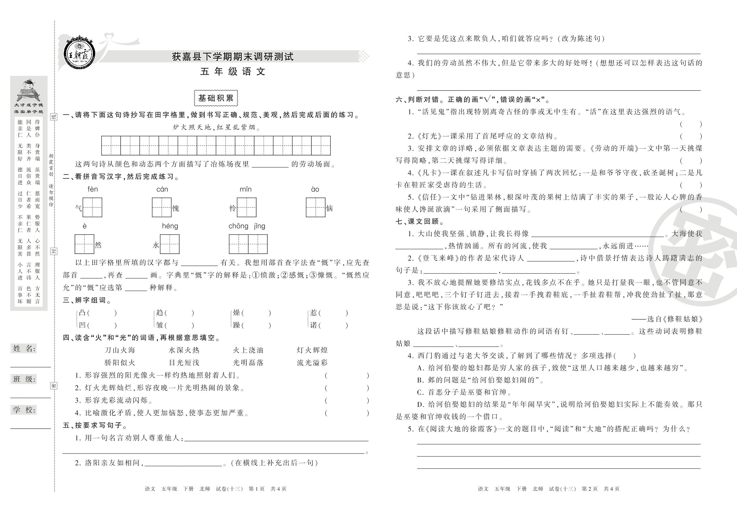 2015-2016学年第二学期新乡市获嘉县五年级语文试卷(北师版)【13】
