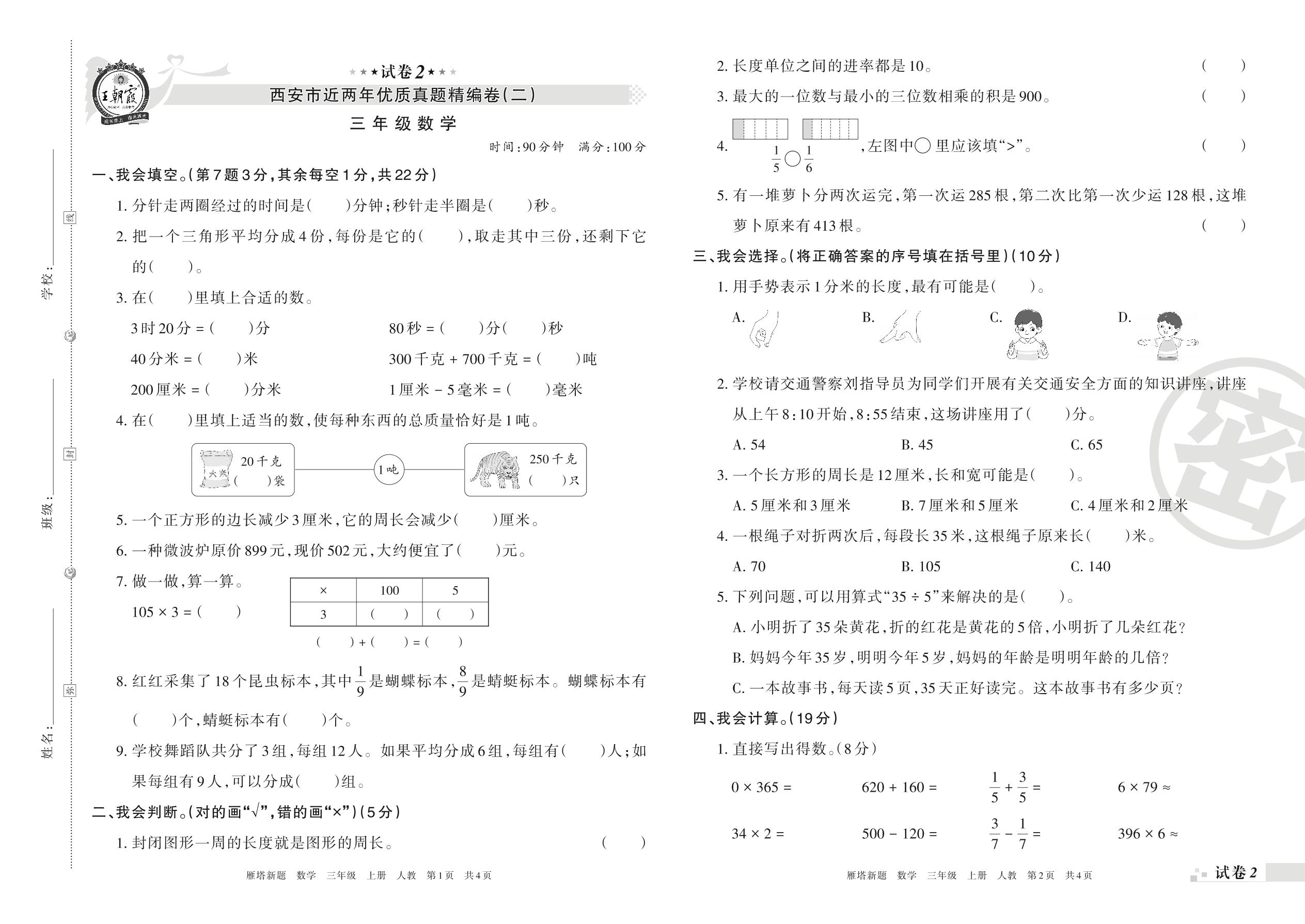西安市近两年优质真题精编卷(二)三年级上册数学(人教版)【2】