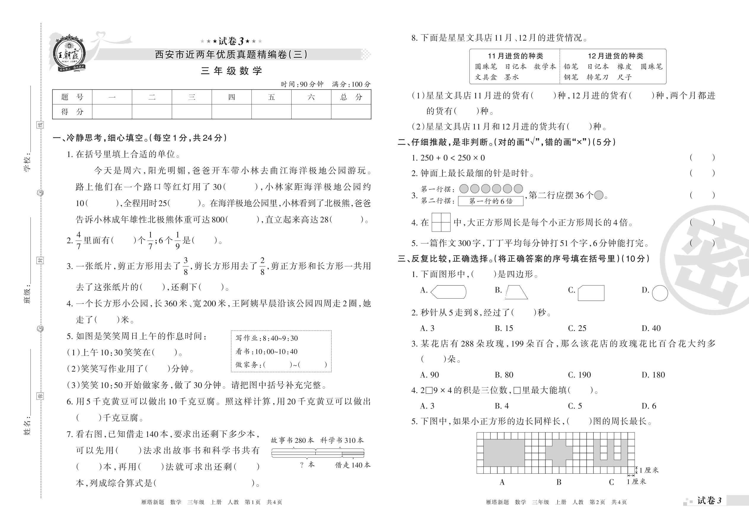 西安市近两年优质真题精编卷(三)三年级上册数学(人教版)【3】