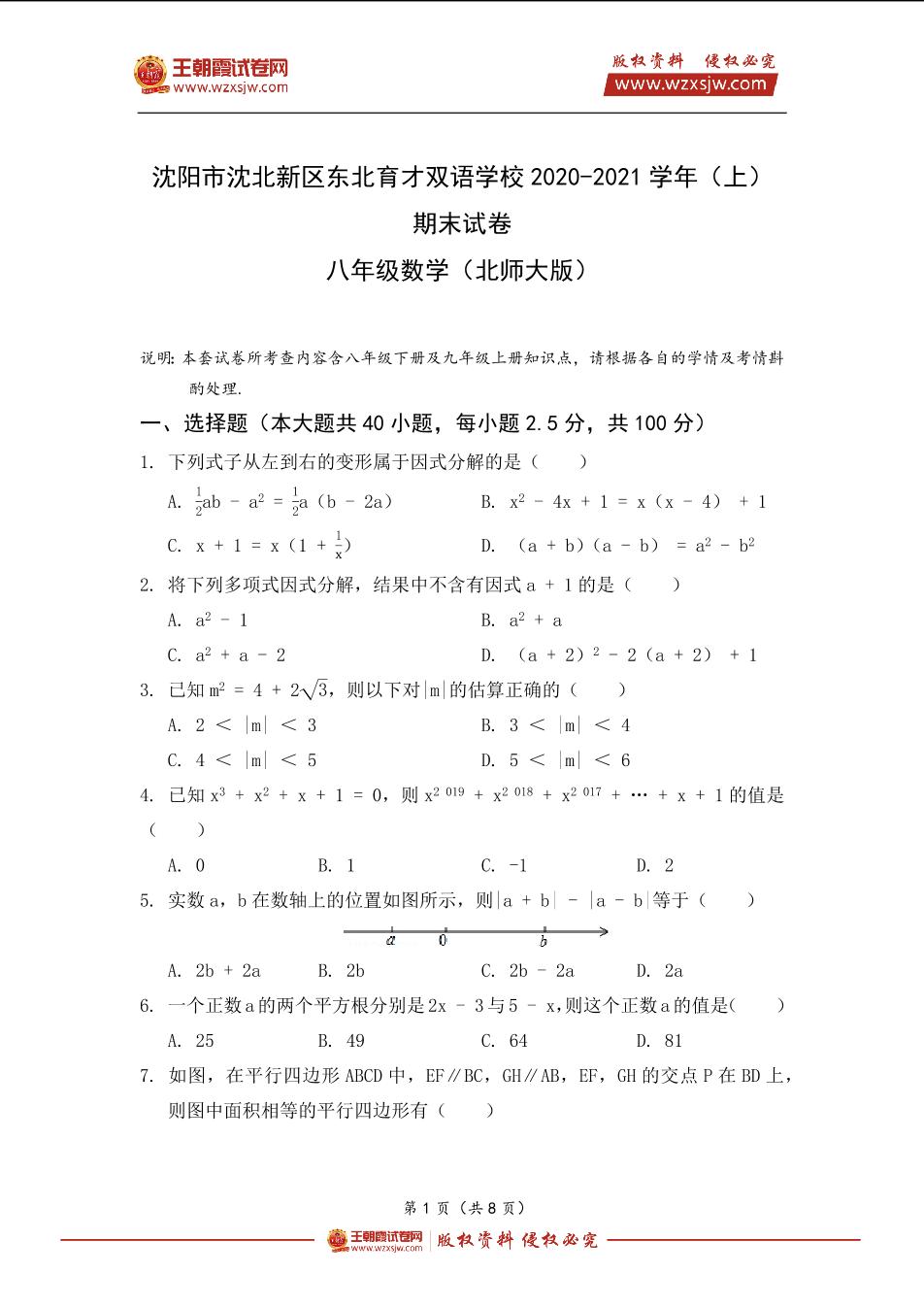 沈阳市沈北新区东北育才双语学校2020-2021学年(上)期末试卷八年级数学(北师大版)