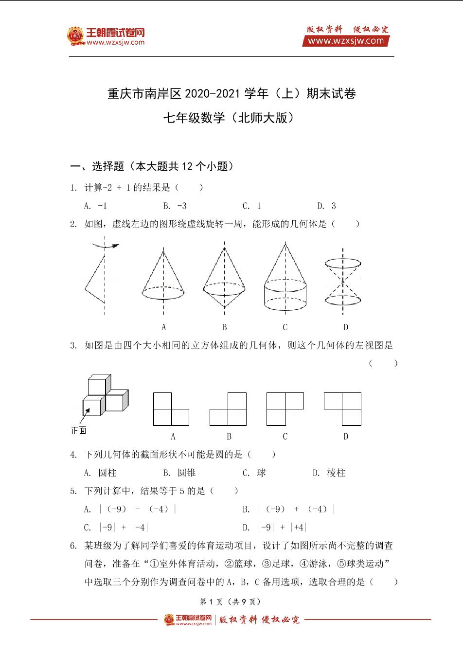 重庆市南岸区2020-2021学年(上)期末试卷七年级数学(北师大版)