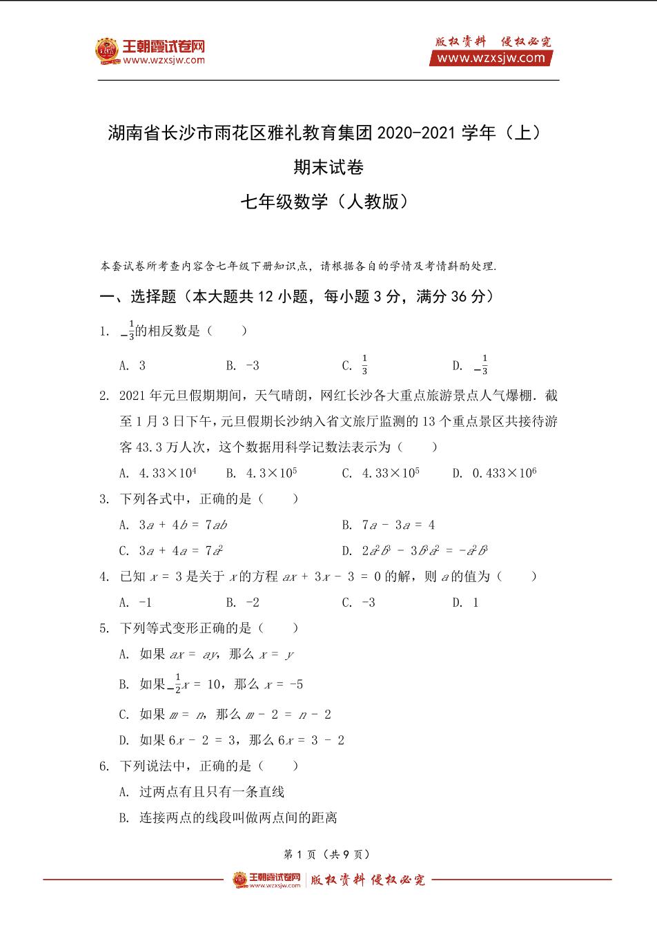 湖南省长沙市雨花区雅礼教育集团2020-2021学年(上)七年级数学期末试卷(人教版)