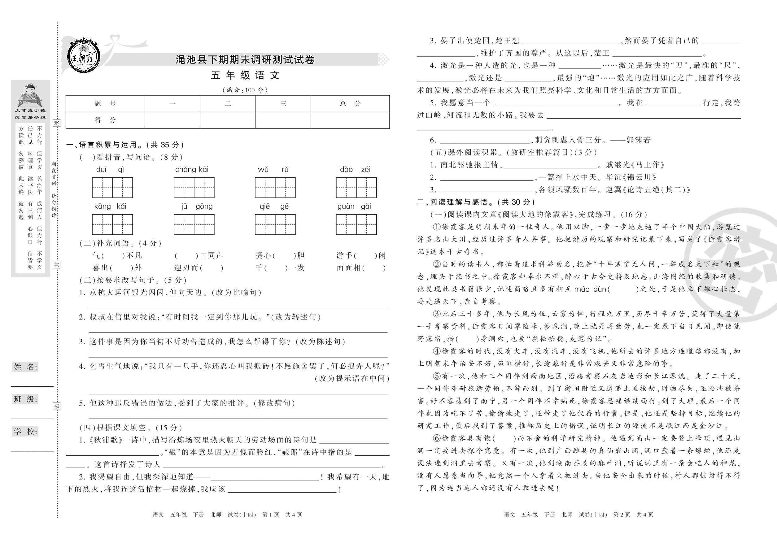 五年级语文北师版下册期末卷