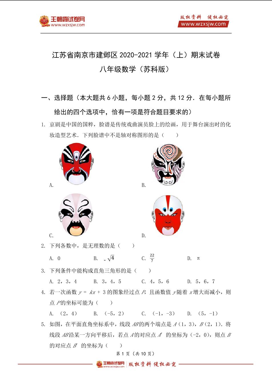 江苏省南京市建邺区2020-2021学年八年级(上)期末数学试卷(苏科版)