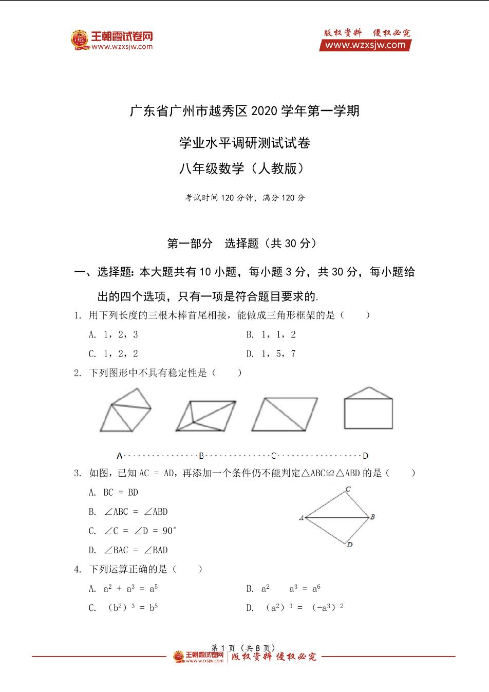 广东省广州市越秀区2020学年第一学期学业水平调研测试试卷八年级数学(人教版)