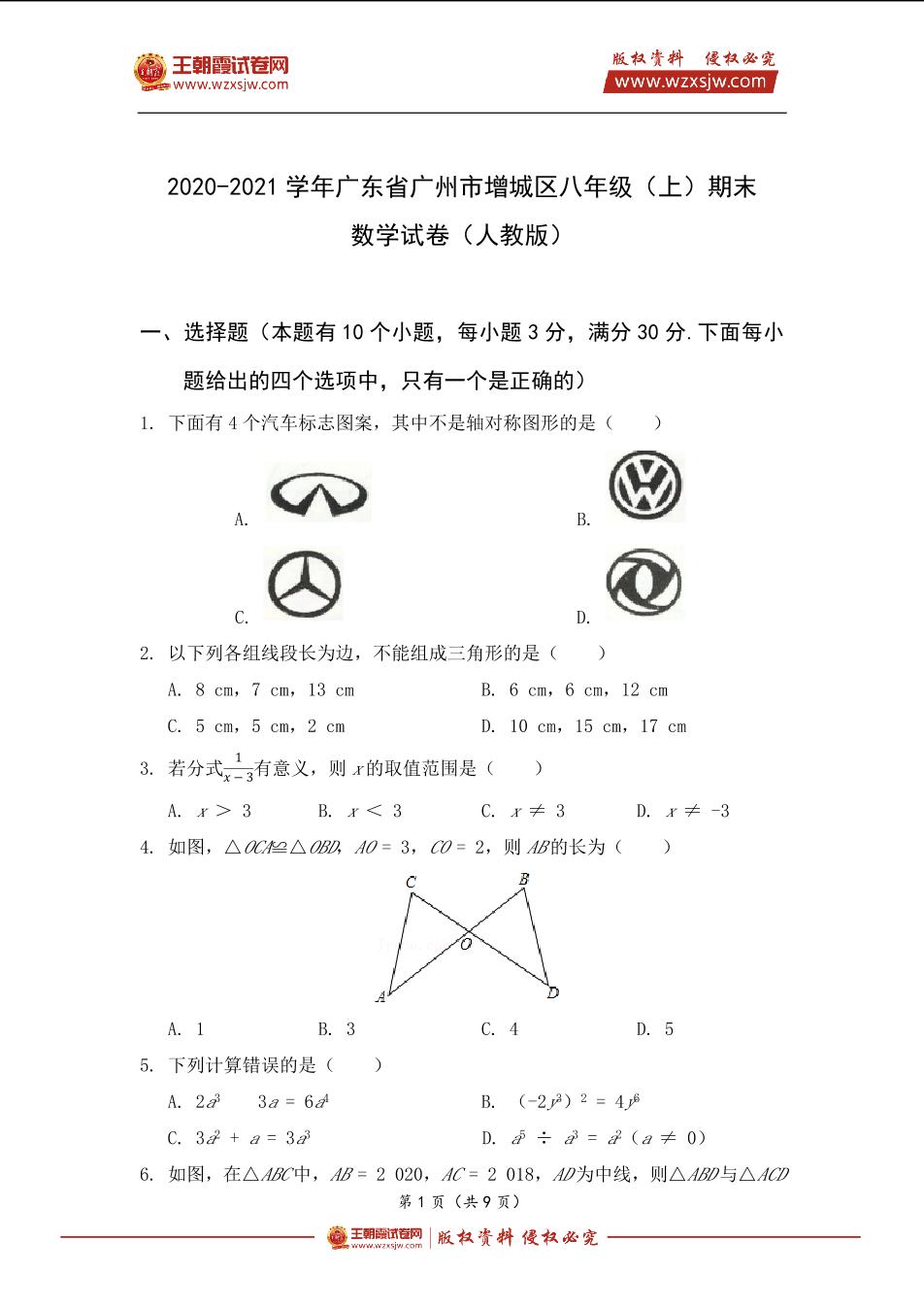 广东省广州市增城区2020-2021学年八年级(上)期末数学试卷(人教版)