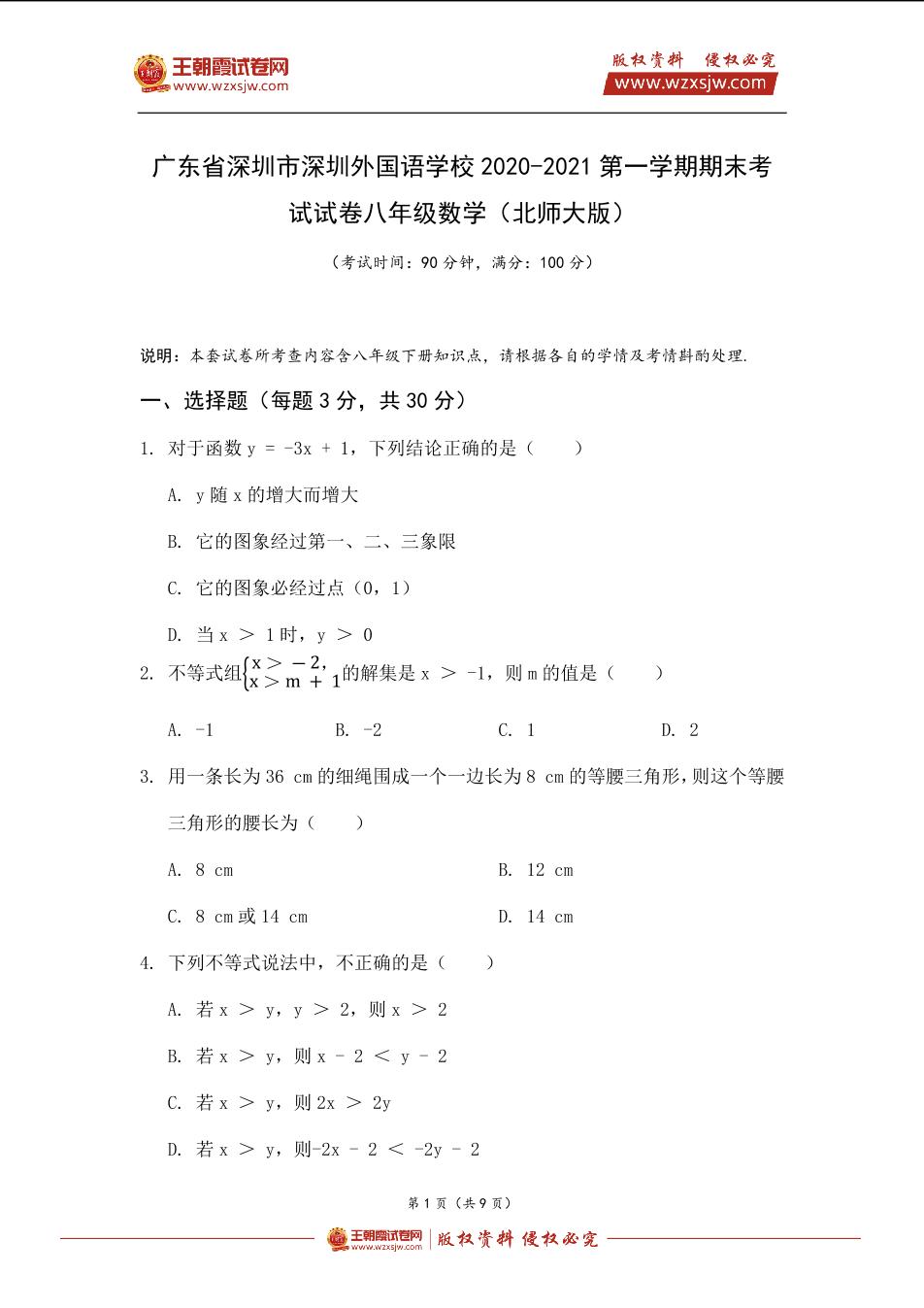 广东省深圳市深圳外国语学校2020-2021第一学期期末考试试卷八年级数学(北师大版)