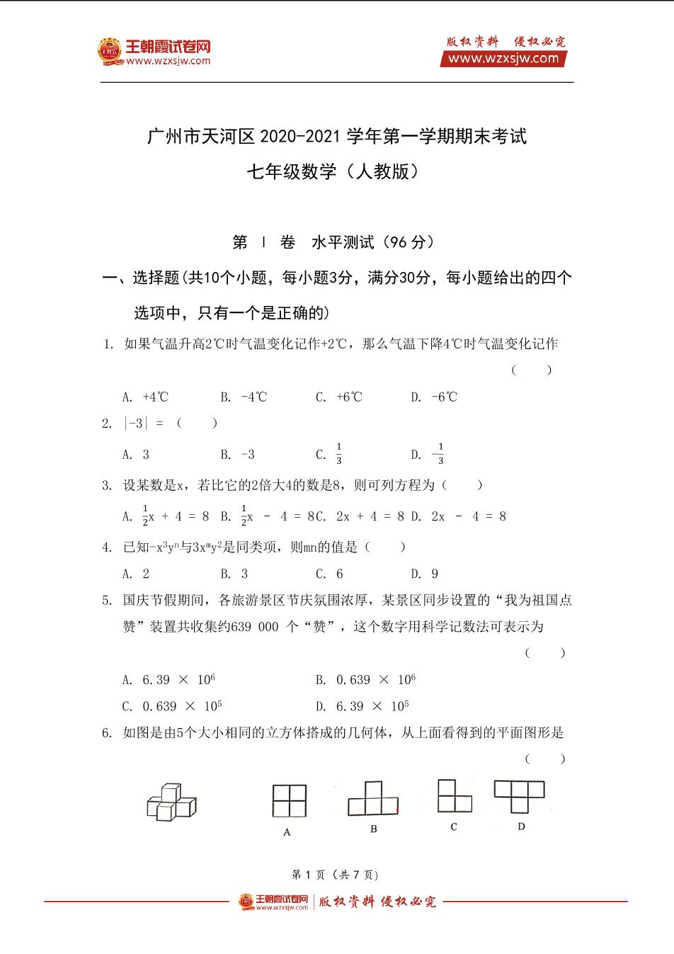 广州市天河区2020-2021学年第一学期七年级数学期末考试(人教版)