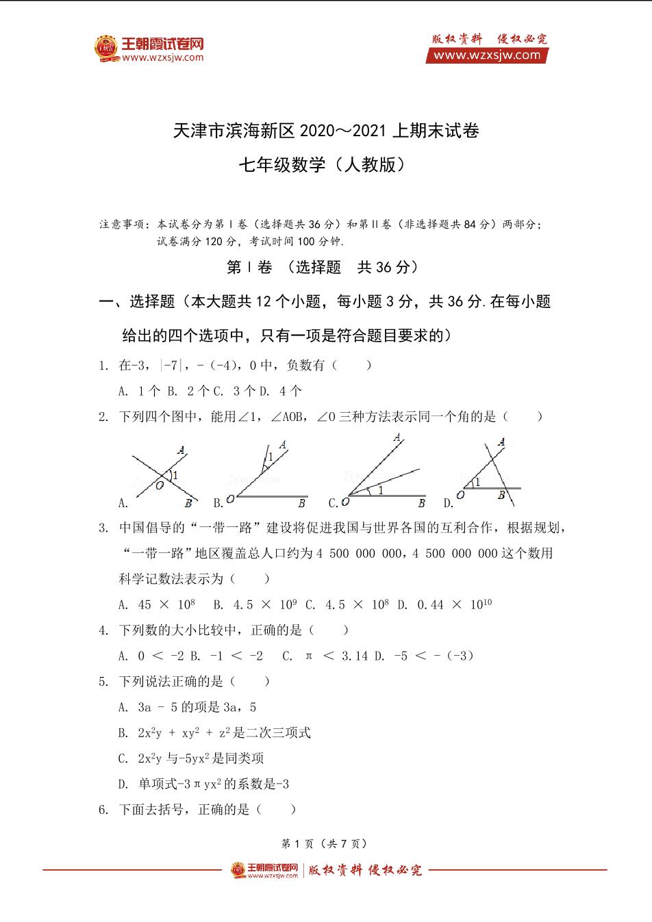 天津市滨海新区2020~2021上期末试卷七年级数学(人教版)
