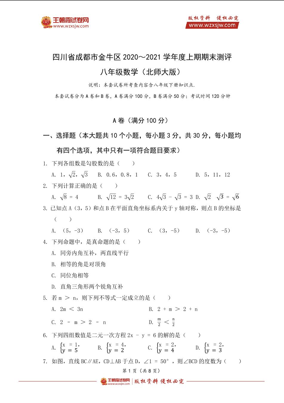 四川省成都市金牛区2020~2021学年度上期期末测评八年级数学(北师大版)