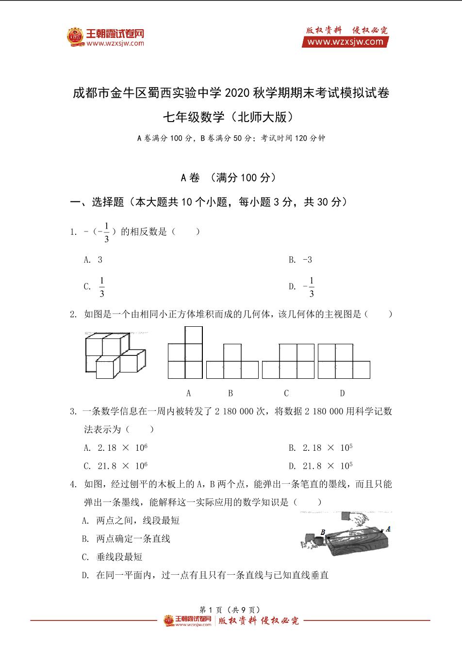 成都市金牛区蜀西实验中学2020—2021学年上学期初中七年级期末考试数学试卷(北师大版)