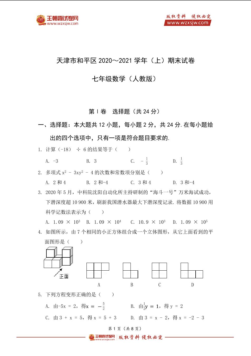 天津市和平区2020~2021学年(上)期末试卷七年级数学(人教版)