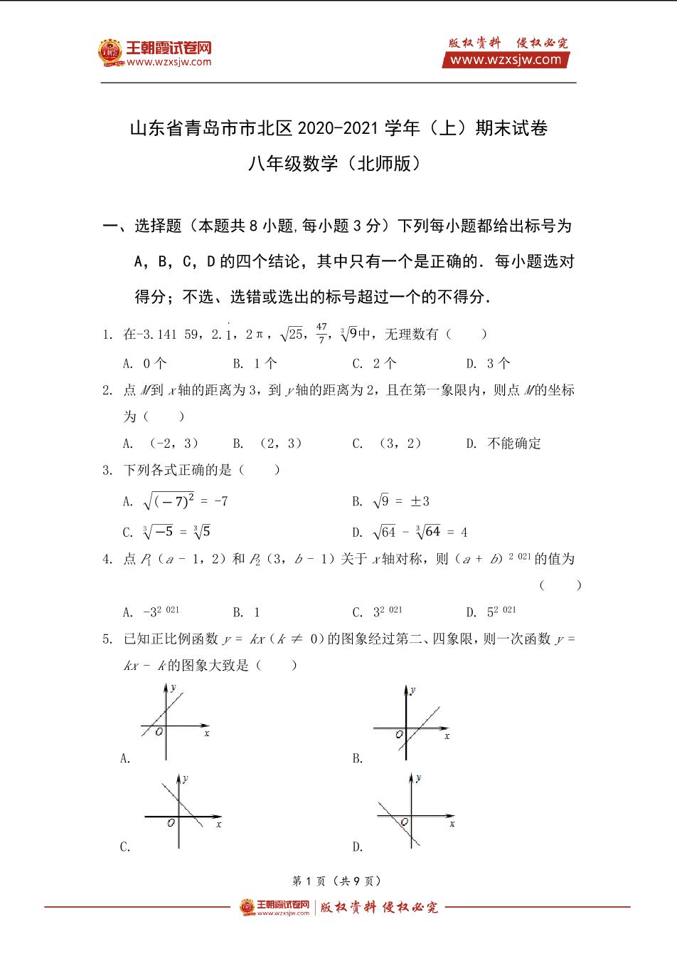 山东省青岛市市北区2020-2021学年八年级(上)期末数学试卷(北师版)