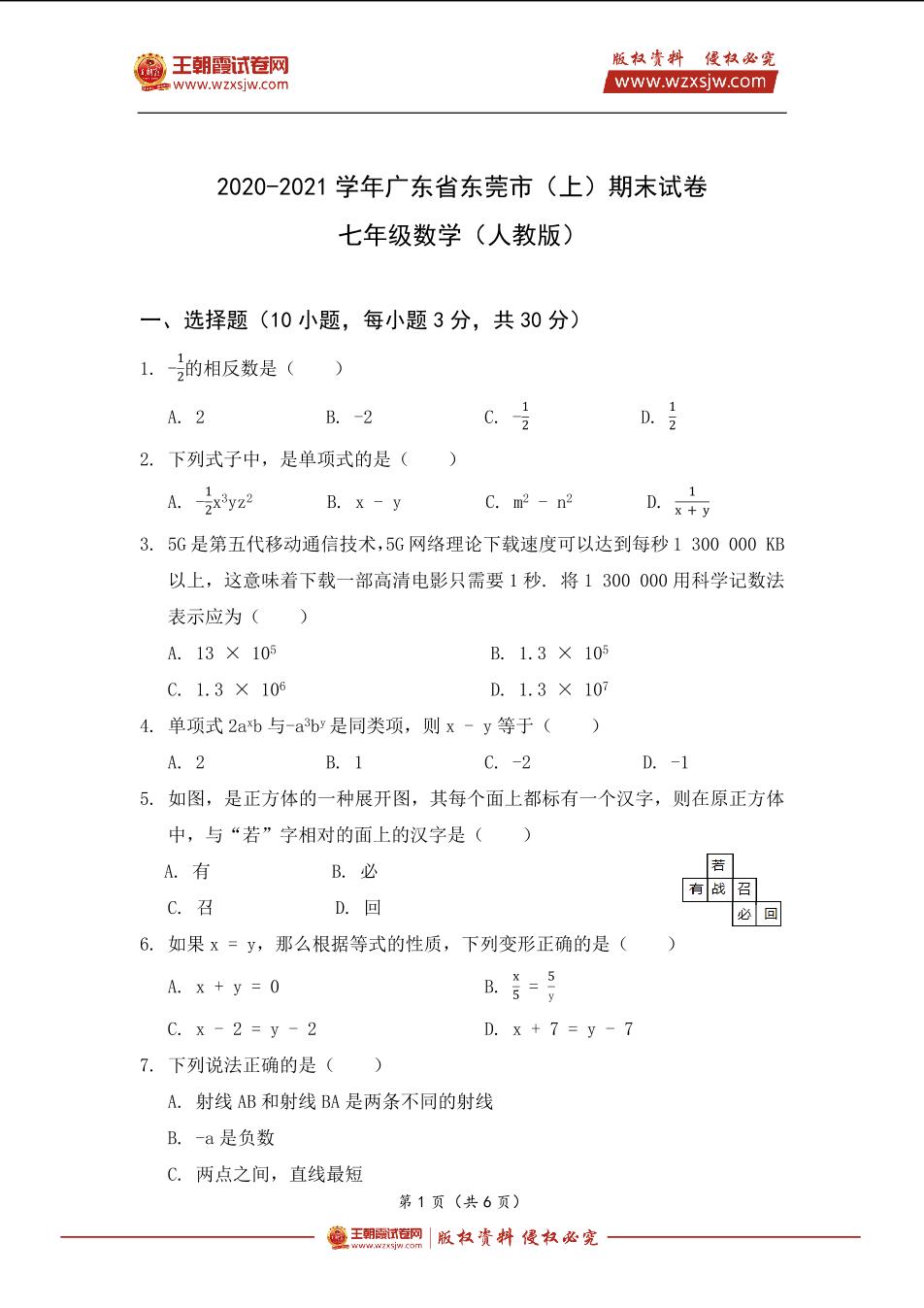 东莞市2020-2021学年上学期初中七年级期末考试数学试卷(人教版)