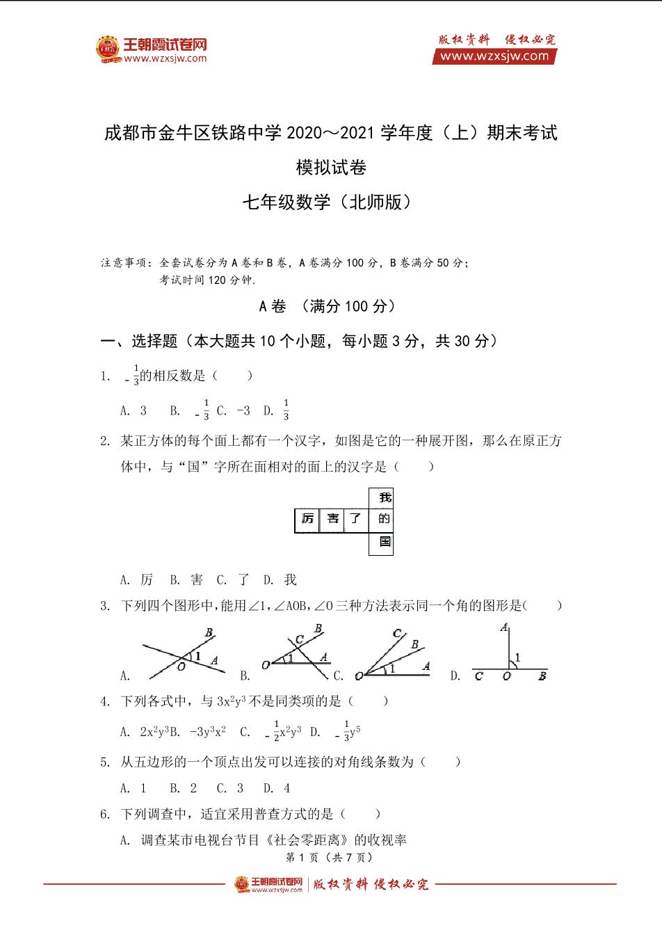 成都市金牛区铁路中学2020~2021学年度(上)期末考试模拟试卷七年级数学(北师版)