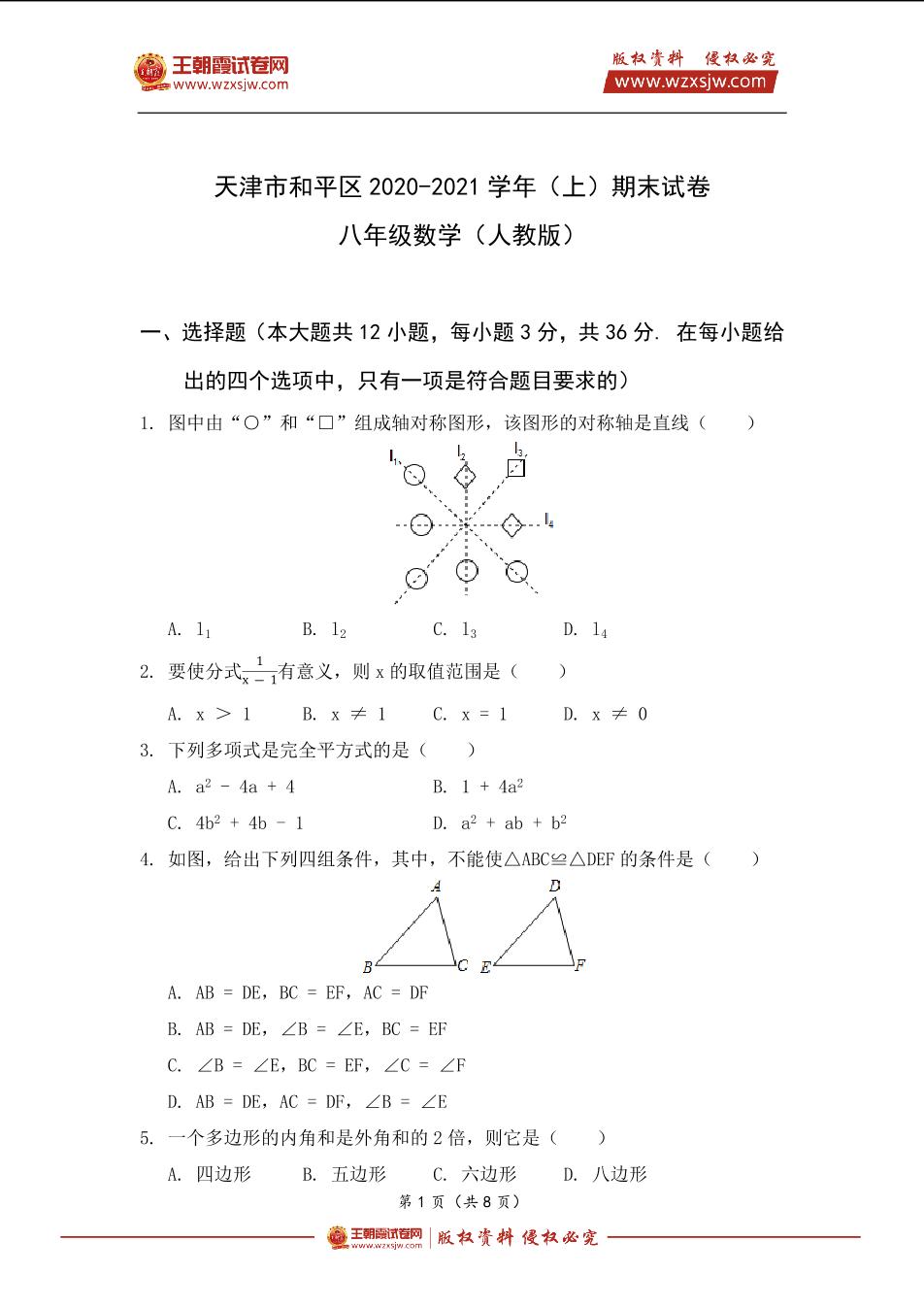 天津市和平区2020-2021学年八年级(上)期末数学试卷(人教版)