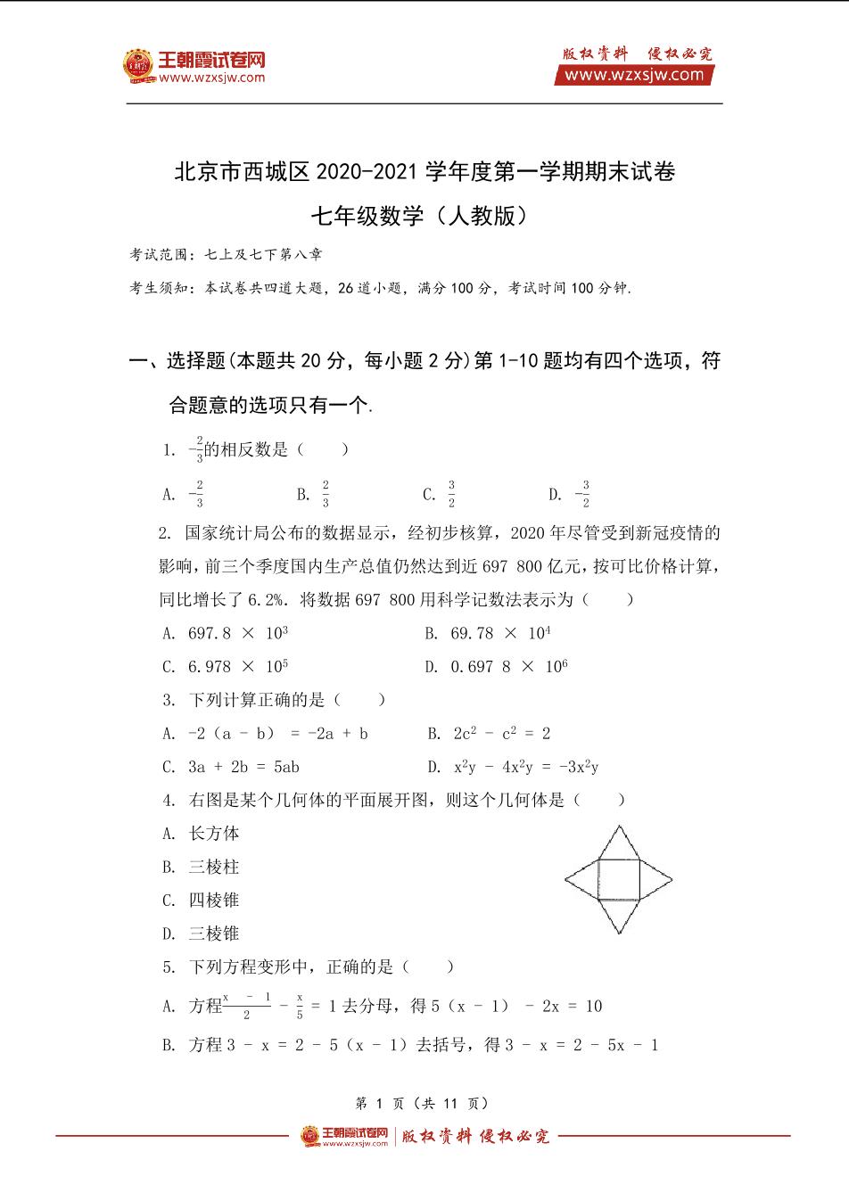 北京市西城区2020-2021学年度第一学期期末试卷七年级数学(人教版)