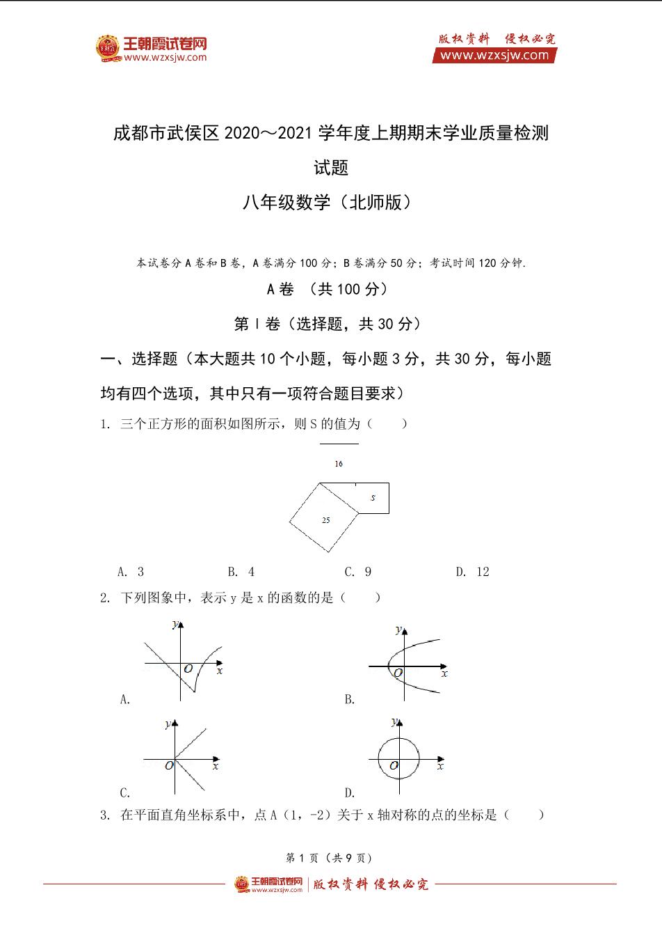 成都市武侯区2020~2021学年度上学期期末质量检测试题八年级数学(北师版)