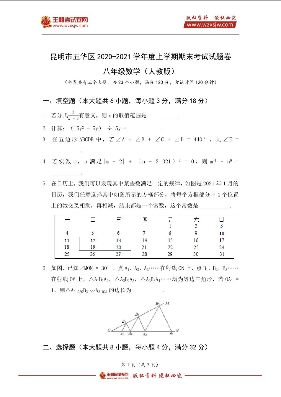昆明市五华区2020-2021学年度上学期八年级数学期末考试试题卷(人教版)