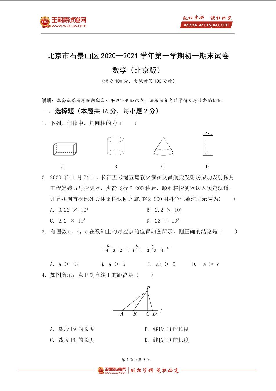 北京市石景山区2020—2021学年第一学期初一期末试卷数学(北京版)