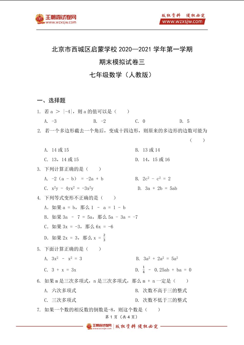 北京市西城区启蒙学校2020-2021学年第一学期人教版七年级上册 期末数学模拟试卷三(人教版)