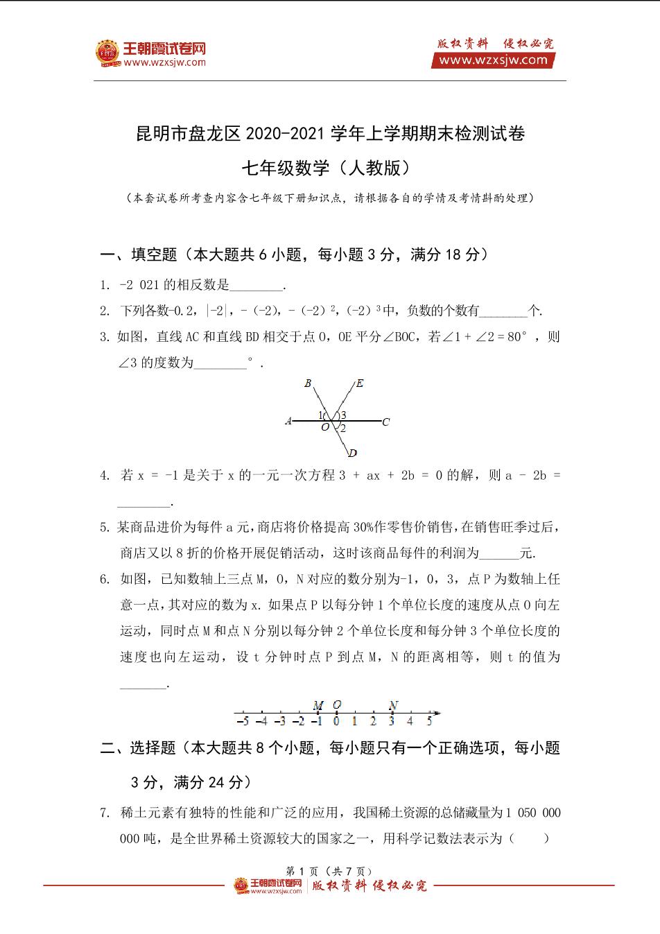 云南省昆明市盘龙区2020_2021学年上学期初中七年级期末考试数学试卷(人教版)