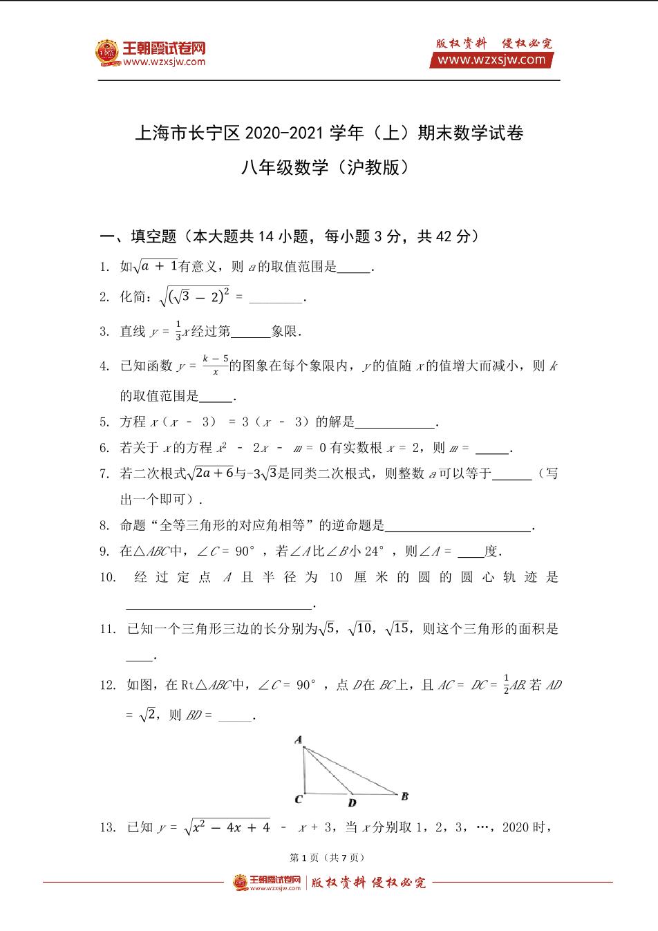 上海市长宁区2020-2021学年八年级(上)期末数学试卷(沪教版)