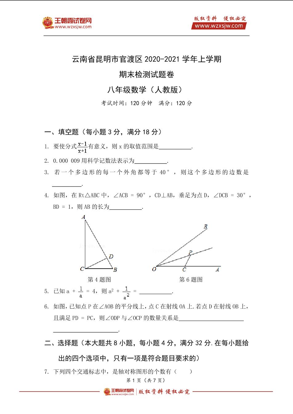 云南省昆明市官渡区2020-2021学年上学期期末检测试题卷八年级数学(人教版)
