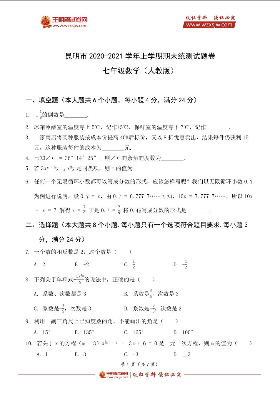 昆明市2020-2021学年上学期初中七年级期末考试数学试卷(人教版)