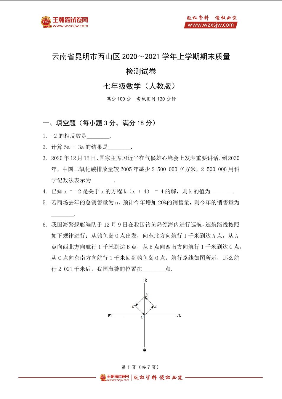 云南省昆明市西山区2020~2021学年上学期期末质量检测试卷七年级数学(人教版)
