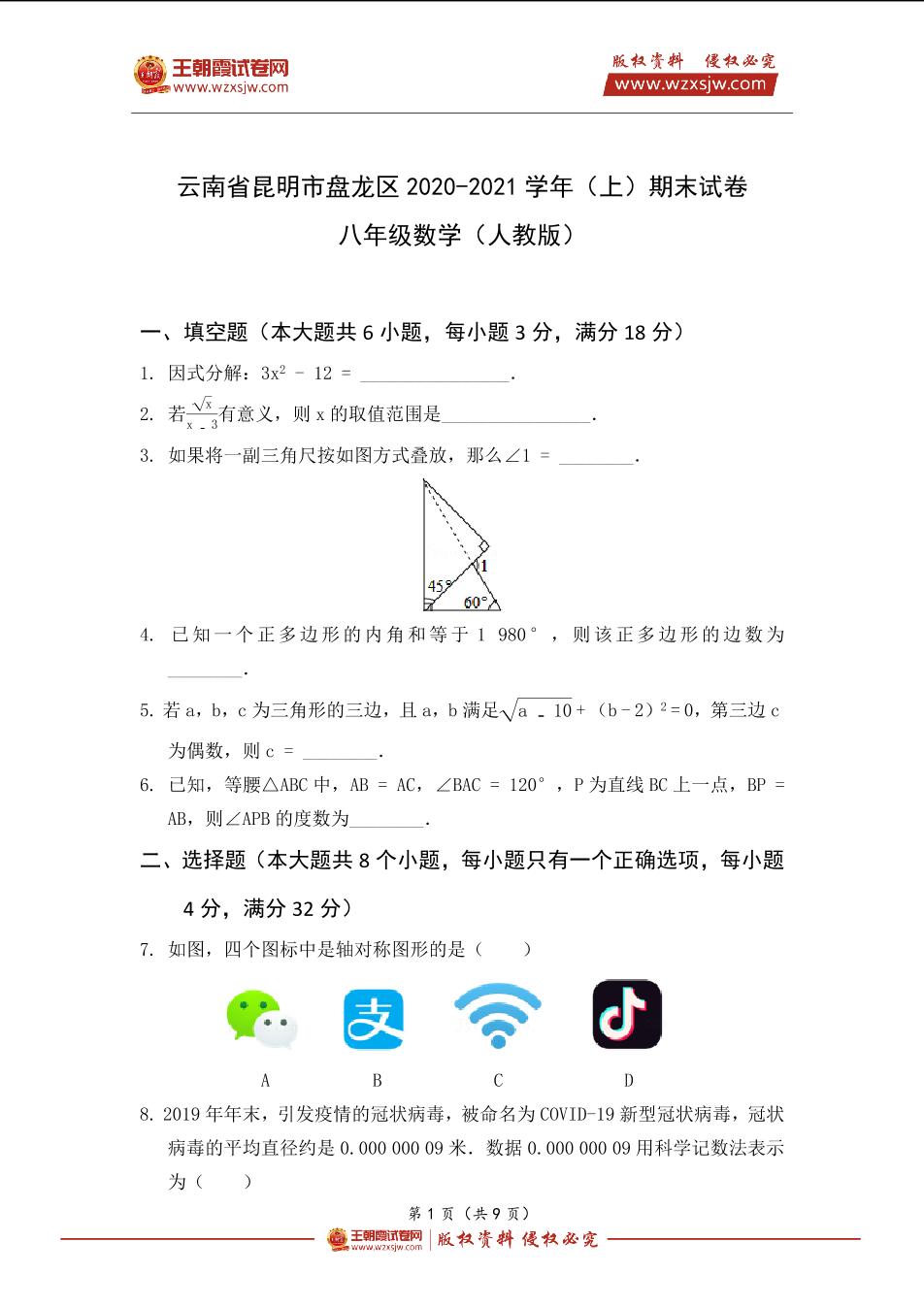 云南省昆明市盘龙区2020-2021学年八年级(上)期末数学试卷(人教版)
