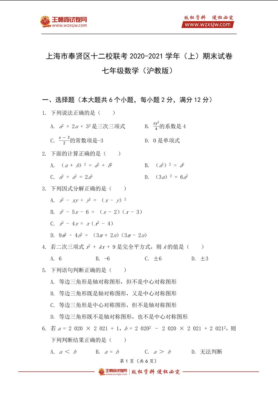 上海市奉贤区十二校联考2020-2021学年七年级(上)期末数学试卷(沪教版)