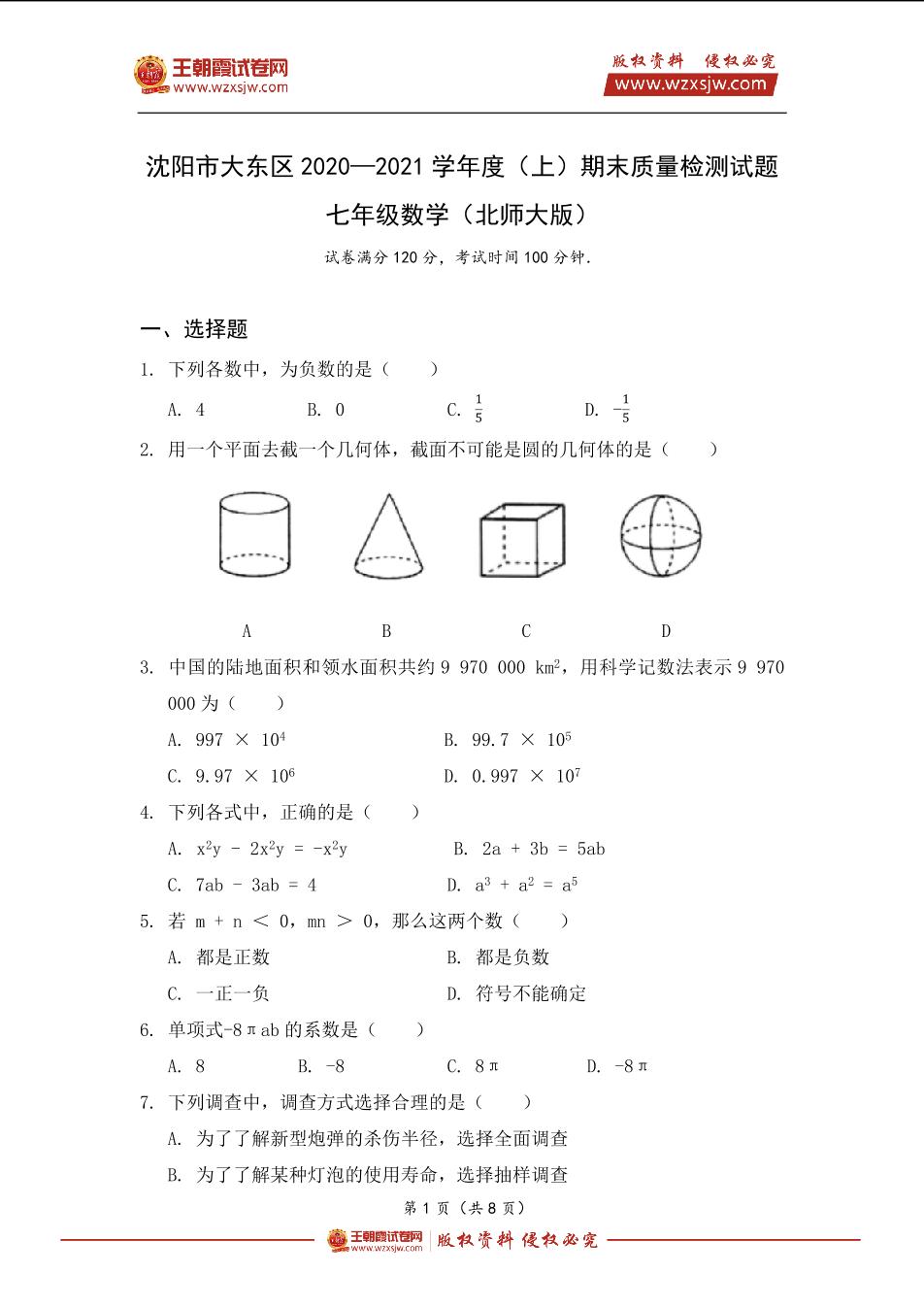 沈阳市大东区2020—2021学年度(上)期末质量检测试题七年级数学(北师大版)