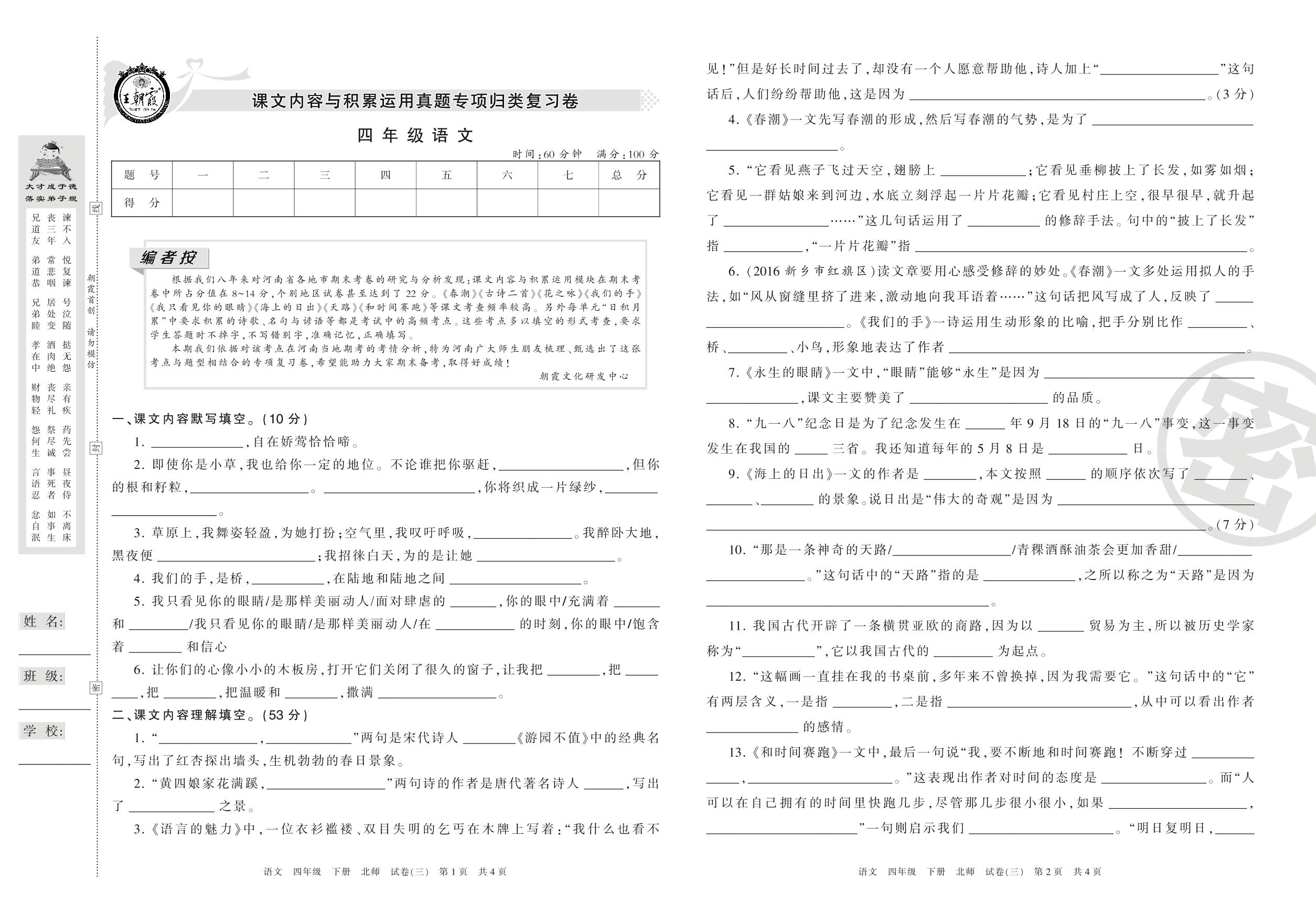 王朝霞期末专项卷四年级下册语文(北师版)_R210801202826【3】