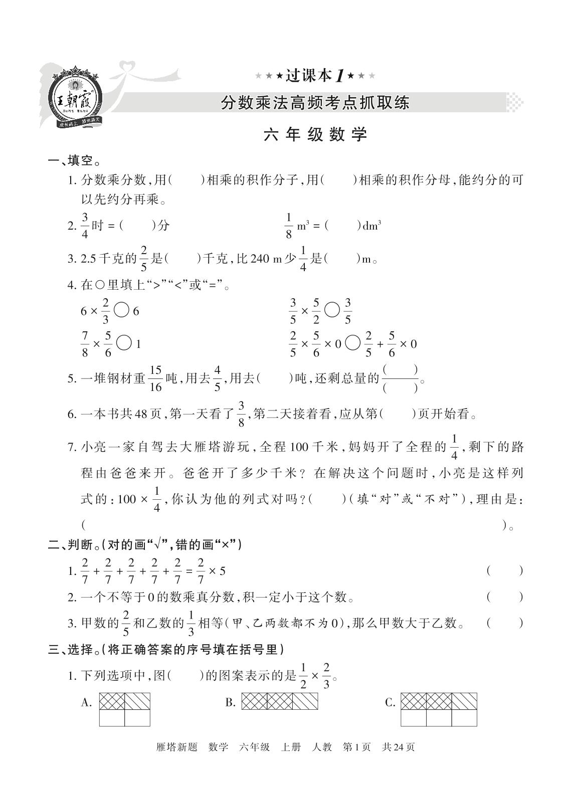 王朝霞期末过课本——分数乘法高频考点抓取练六年级上册数学(人教版)_R211117172846986【1】
