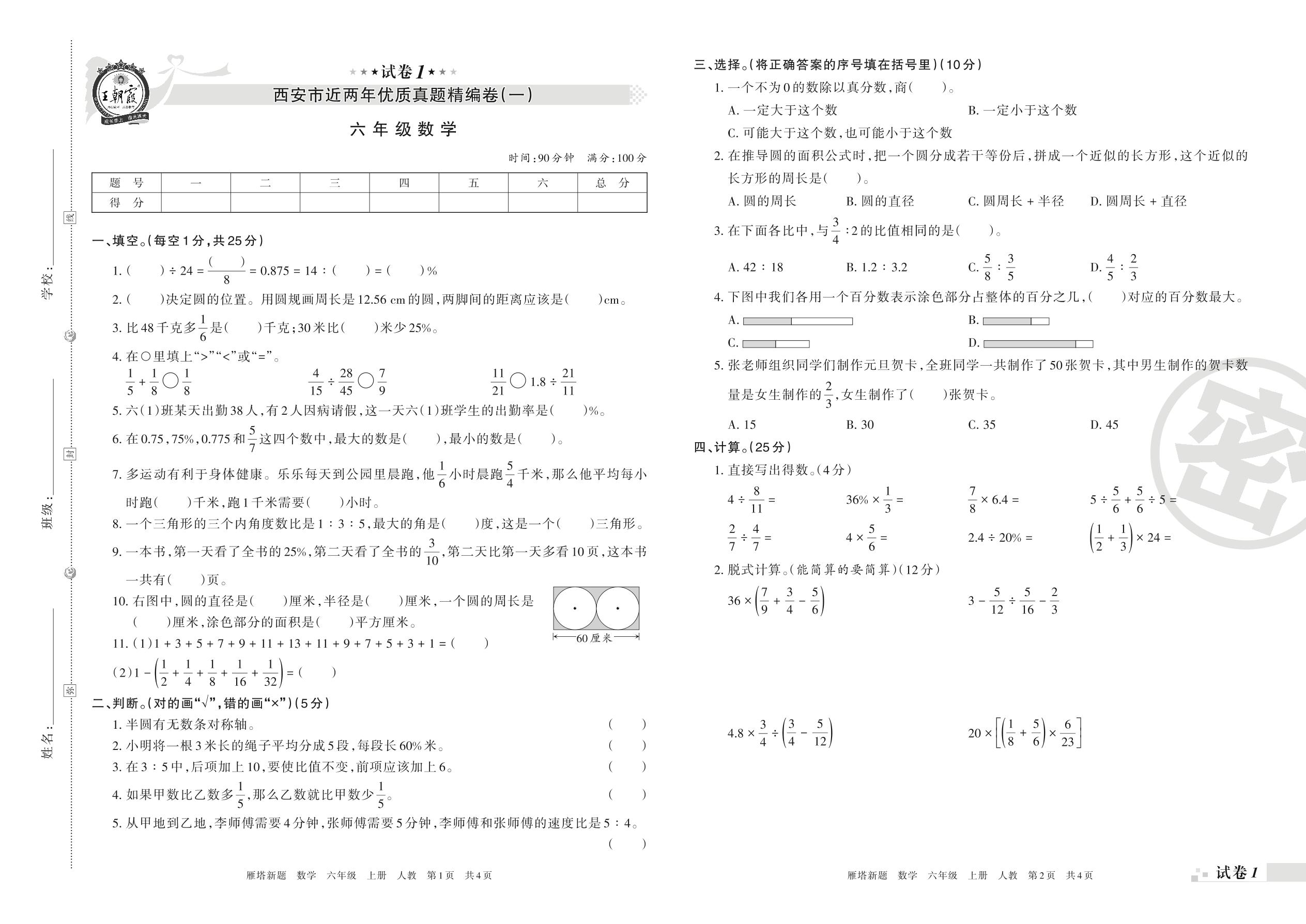 西安市近两年优质真题精编卷(一)六年级上册数学(人教版)【1】