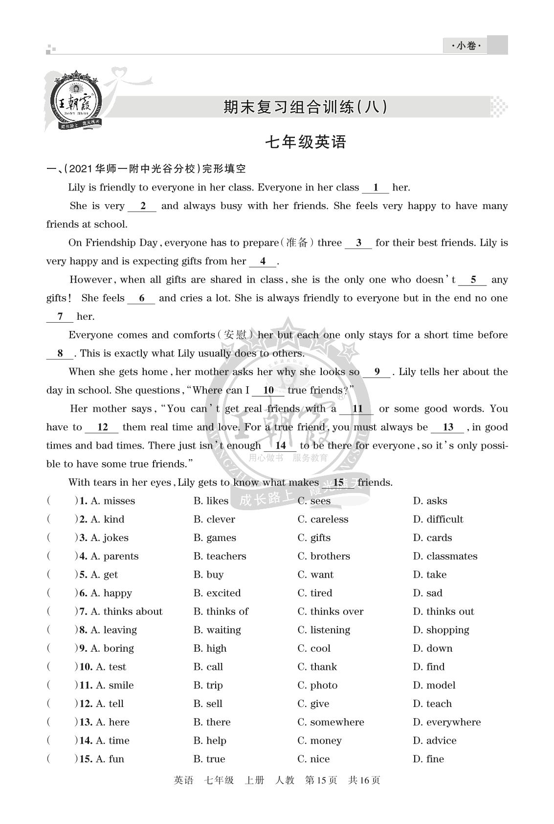 王朝霞期末小卷——期末复习组合训练(八)七年级上册英语(人教版)【8】